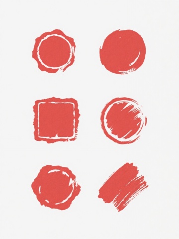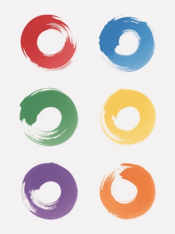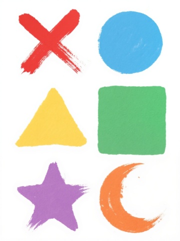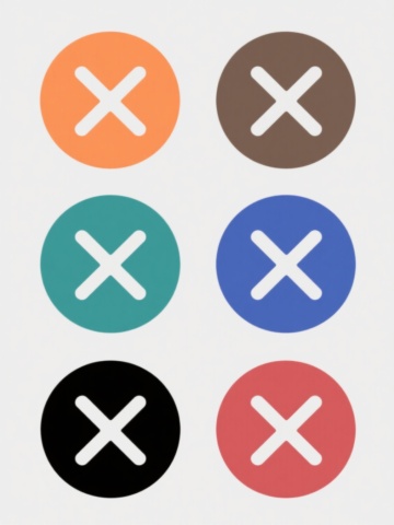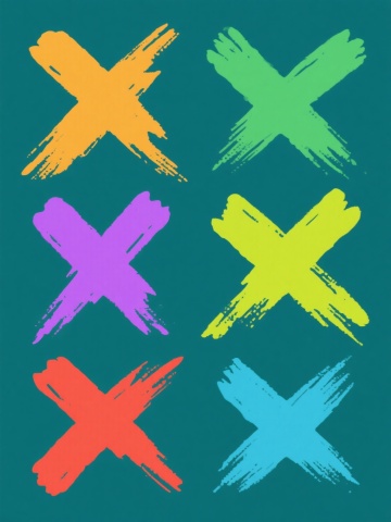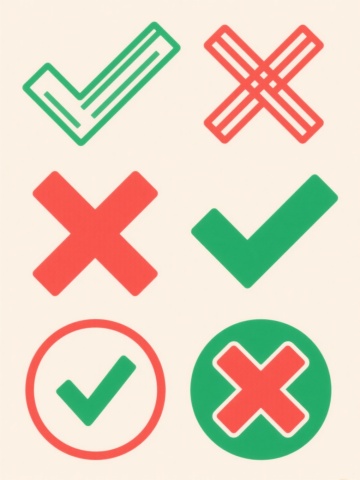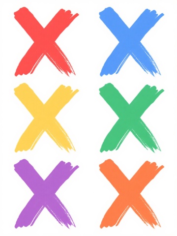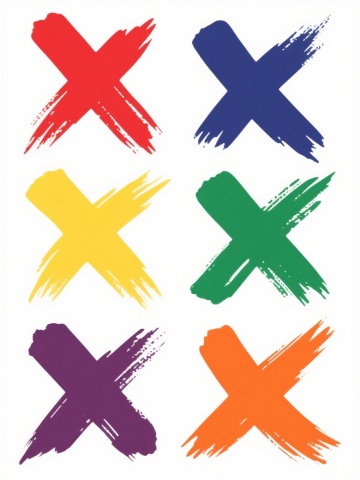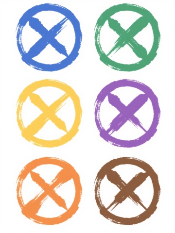 六个不同配色、不同样式、不同材质的「对错」造型图标,采用手绘笔触风格,具有明显的笔刷纹理和边缘毛躁感,色彩鲜明且各自独立,上下两行整齐对齐排列,置于浅色背景上,整体呈现简洁而富有艺术感的视觉效果