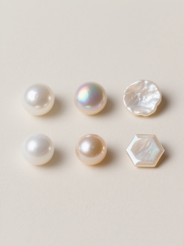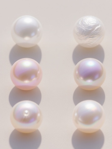 一张展示6个不同样式、不同光效珍珠素材造型的设计图,采用浅色背景,珍珠上下两行对齐排列。每个珍珠均呈现出高品质3D渲染效果,拥有圆润饱满的球体形态,表面光滑细腻,具有珍珠特有的柔和光泽与微妙虹彩晕染。不同珍珠的光效设计各具特色:有的展现强烈的单点高光配合柔和漫反射,有的呈现多光源照射下的复杂光影层次,有的强调深邃的阴影与明亮的反光对比,有的则突出珍珠半透明质地带来的温润光泽感,有的模拟自然散射光下的均匀细腻光泽,有的通过特殊光源营造出独特的光斑或光晕效果。整体构图简洁大方,珍珠之间间距均匀,排列整齐有序,光线效果清晰地展现了珍珠的立体感、材质感和高级质感,画面干净利落,视觉重点突出,达到了专业产品展示图的设计水准。