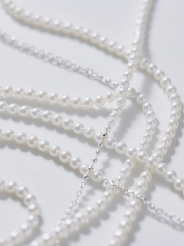 多串银白色珍珠链子以自然垂落与交叉缠绕的姿态分布在纯白色背景上,珍珠颗粒圆润饱满,表面光滑且带有细腻柔和的光泽感,光影过渡自然,整体画面风格极简干净,构图简洁大方,无任何多余装饰元素,突出珍珠链子本身的优雅质感与线条美感。
