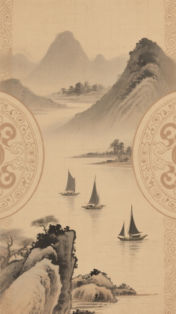 中国传统水墨风格的中式国风背景,淡雅的米色宣纸质感,浅灰色调的远山连绵起伏,左侧底部有云纹图案,右上角有竹叶摇曳,空中点缀着几只飞鸟,整体营造出宁静悠远的东方意境,线条简洁流畅,水墨晕染自然,留白恰到好处,充满古典韵味。
