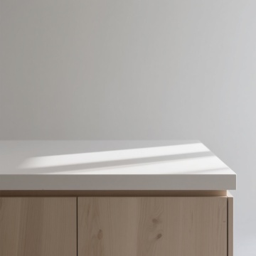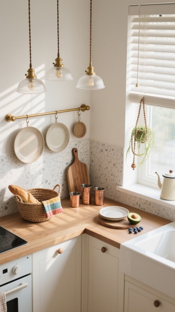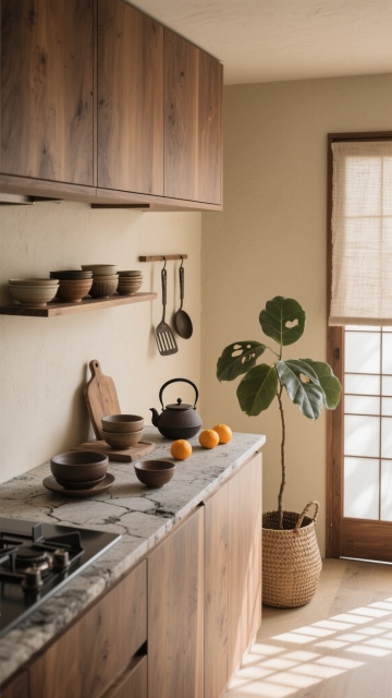 中景俯视角,在一个融合自然材质与几何美学的日式侘寂风厨房空间,浅米色硅藻泥墙面与烟熏橡木色的悬浮式橱柜形成温暖对比,台面选用带有天然冰裂纹理的火山岩材质,边缘打磨得圆润柔和。晨光透过亚麻质地的半透光障子门,在地面投下细密的木纹格栅阴影,光线呈现出柔和的米黄色调。料理台上,粗陶制成的深褐色食器套装随意摆放,旁边是一个手工编织的藤篮,里面盛放着几颗表皮粗糙的柑橘,复古铸铁茶壶正冒着袅袅热气,旁边点缀着一株小型琴叶榕盆栽,叶片上的天然虫洞更显岁月质感。开放式层架上陈列着不同釉色的粗陶碗碟,墙面悬挂着手工锻造的铁艺锅铲套装,整体构图强调材质的原始肌理与器物的自然磨损感,营造出淡泊宁静又充满生活温度的烹饪空间。
