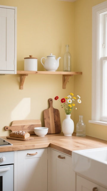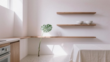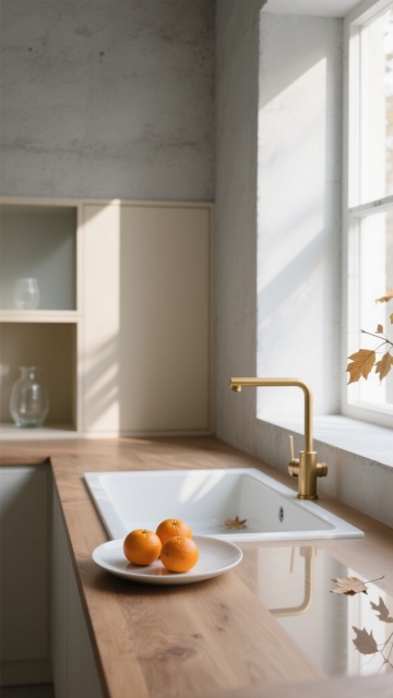 极简构图,空旷的北欧厨房角落,大面积留白的浅灰色水泥墙面占据画面60%,右侧窗框切割出柔和的晨光,光线在墙面上形成微妙的几何阴影图案,左侧悬垂着一盏极简黄铜吊灯,下方是窄长的深橡木工作台,台面仅放置一个素白粗陶碗和一支斜插的干薰衣草,远处开放式层架上隐约可见两个叠放的浅灰陶瓷罐,整体色调为高级灰与原木棕的低饱和对话,光线通透柔和,营造出安静、留白、充满呼吸感的侘寂美学空间,适合作为背景使用。