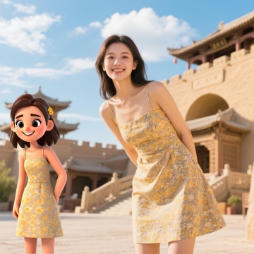 清新甜美,2D&3D混搭风,拟人卡通女孩与真人同框,海边度假氛围。