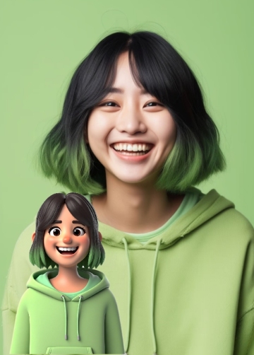 清新自然背景,卡通动漫风人物,时尚穿搭,展现活力与童趣。