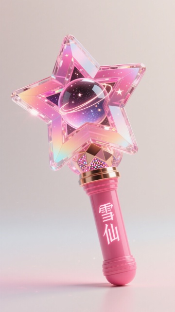 以玫红编织梦幻星芒,星星应援棒握柄镌刻「雪仙子」,光影流转间似有精灵低语,为每一份炽热应援注入童话般的温柔力量。