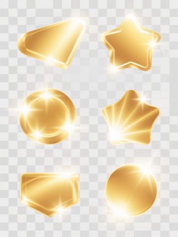 一套6个不同造型与角度的金色光效元素集合,每个元素均保持原金色渐变质感、明亮高光与柔和光线扩散效果,背景为透明(棋盘格示意),元素造型包括放射状光芒、星形光斑、环形光晕、线性光束、不规则闪光和点状星光,整体排布规整,所有元素采用相同的金色调与光效风格,形成统一的系列素材。