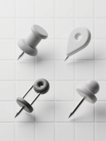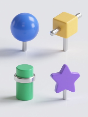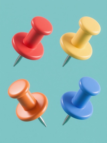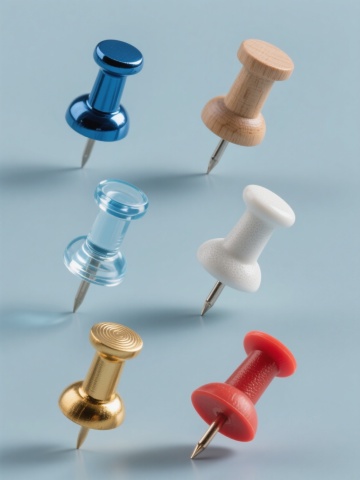 6个不同材质的图钉系列素材集合,规整排布在纯色背景上。每个图钉保持经典图钉造型(圆形平头、圆柱形钉身、尖细钉尖),但材质和视觉质感完全不同:1. 高光泽金属蓝色图钉,表面有强烈反光和细腻高光,呈现出光滑的塑料或金属质感,带有自然阴影;2. 哑光木质图钉,呈现原木纹理和温暖的木色,表面有细微的木纹肌理和柔和的漫反射光影;3. 透明玻璃图钉,清澈通透,带有玻璃特有的折射光影效果和轻微的蓝色调,钉尖为银色金属;4. 磨砂陶瓷图钉,表面粗糙有颗粒感,呈现均匀的白色,带有柔和的哑光光泽;5. 闪亮金色金属图钉,金属质感强烈,表面有精致的拉丝纹理,呈现出奢华的金色光泽;6. 柔软橡胶质感图钉,颜色为鲜艳的红色,表面有细微的防滑纹理,呈现出柔软有弹性的质感。所有图钉大小一致,以2x3的网格形式规整排列,每个图钉下方都有自然的阴影,整体画面简洁、现代、具有产品展示感。