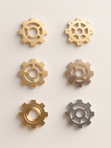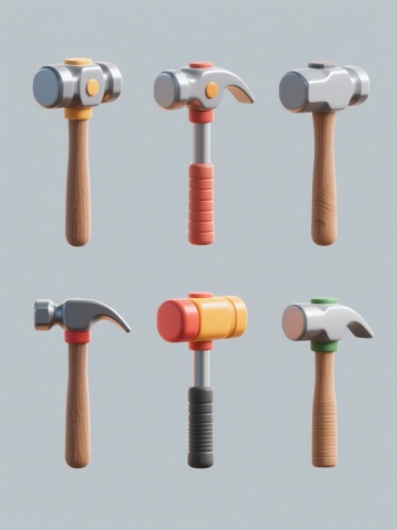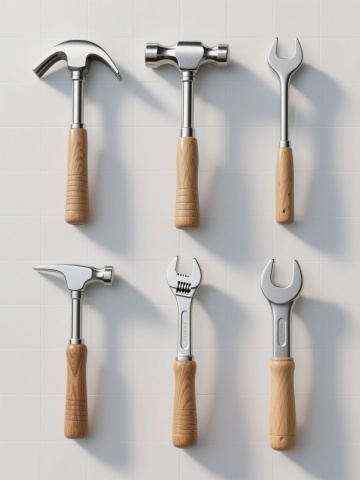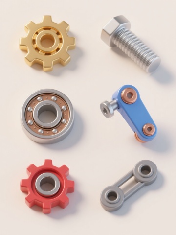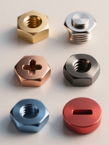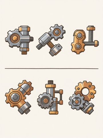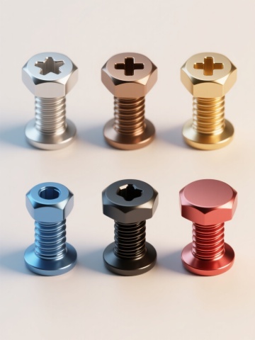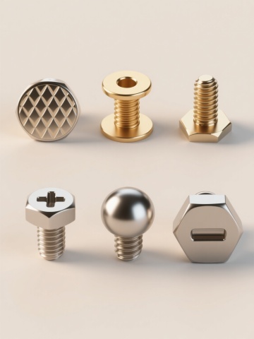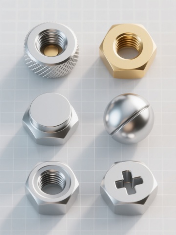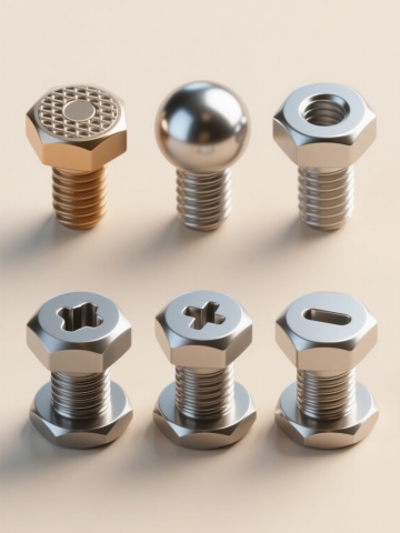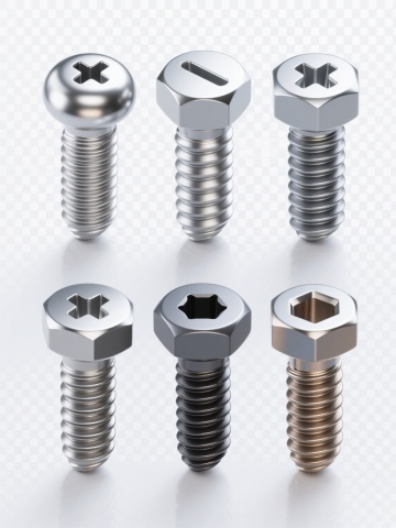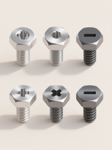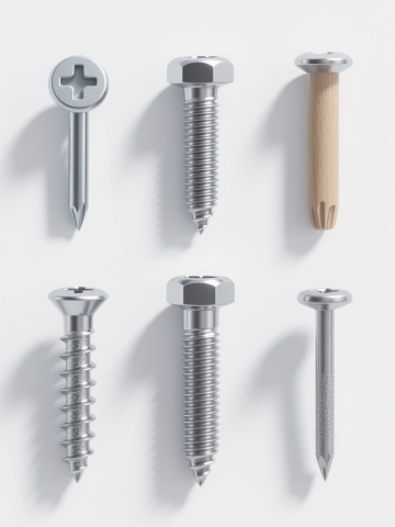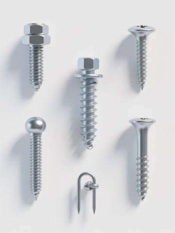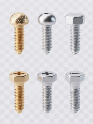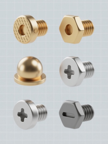 一套6个不同五金紧固件工具的系列图标,保持统一的极简3D渲染风格,每个元素都具有金属银色的光滑质感和清晰的高光阴影效果,包含十字螺丝钉、六角螺栓、膨胀螺丝、自攻螺丝、铆钉和螺母,它们以规整的2x3网格排布在纯色浅灰色背景上,每个工具图标独立清晰,整体呈现出专业、精准的工业设计感,确保视觉风格、光影处理和材质表现与原图高度一致。