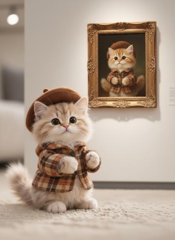 拟人风小猫身着格纹外套与贝雷帽,凝视墙上油画风格的自我肖像,融合3D质感与欧洲宫廷艺术氛围,萌趣中透出文艺气息。