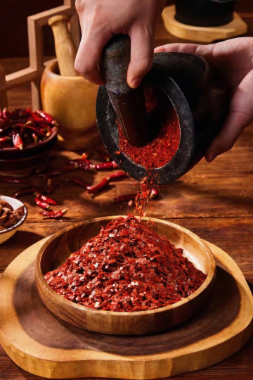 特写镜头下,不锈钢盆中铺满大量被切成小段的新鲜辣椒,辣椒段呈现出鲜明的色彩分区,从左到右依次为鲜亮的黄色、热烈的红色和清新的绿色,色彩过渡自然且对比强烈,辣椒籽与辣椒肉的纹理清晰可见,充满质感。一只手握着中式菜刀正从红色辣椒区域向下切剁,刀刃上沾着细碎的辣椒末,动态感十足,背景为深色,突出主体辣椒的鲜艳色彩和切割动作的生动性,整体画面光影柔和,聚焦于辣椒的丰富色彩和切割瞬间的鲜活感,营造出充满活力和烟火气的烹饪场景氛围。