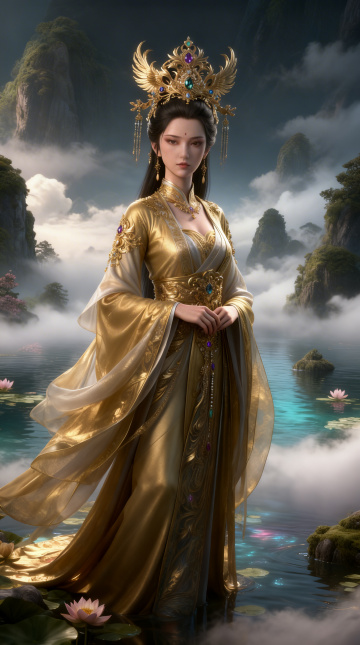 水墨风与工笔风交融,古典美人立于卷轴之上,月光映照下的静谧庭院,白兔相伴,光影朦胧,唯美感与梦幻感交织,尽显中秋佳节的优雅与文艺意境。