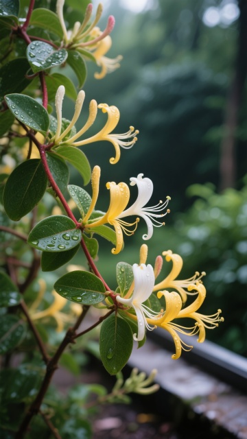 六组金银花系列素材集合,每组均包含白色和淡黄色金银花花朵、绿色叶片及枝干,保持高清写实摄影风格,光线明亮柔和,阴影细腻自然,花朵形态与细节清晰,采用纯色背景,六组金银花以完全不同的自然生长姿态和构图造型规整排布,整体视觉统一且富有变化,适合作为系列素材使用。