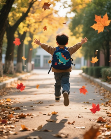 自然光下的户外公园场景,茂盛的深绿色树木形成浓密背景,阳光透过树叶洒下斑驳光影,大片修剪整齐的鲜绿色草坪,前景有几片散落的枯叶。一位穿着黑白波点连衣裙的女性正侧身站立,左手向上伸展高举着泡泡棒,右手自然下垂,身体微微前倾,面带微笑注视着前方;一个穿着白色短袖T恤和深色短裤的小男孩站在她前方稍偏左位置,双脚微微分开,右手伸出试图去触碰那些漂浮在空中、大小不一、表面有彩虹光泽的透明肥皂泡,泡泡在阳光照射下呈现出淡淡的彩色反光。整体画面色彩清新自然,充满温馨欢乐的氛围,构图采用三分法,人物位于画面右侧,泡泡群在两人之间形成视觉连接,呈现出母子互动玩耍的生动瞬间,具有真实生活的质感和温暖的情感传达。