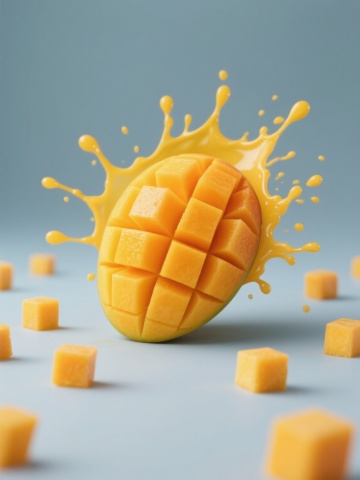 超写实摄影风格,明亮高饱和的黄色背景,多块新鲜菠萝切片——包括半圆形的果肉特写和带果皮的切块——与棱角分明的透明冰块一同悬浮,冰块表面布满细密气泡,大量水珠和气泡在主体周围飞溅,营造出清凉动感的夏日氛围,光线从上方柔和照射,使菠萝的金黄色果肉与冰块的晶莹质感形成鲜明对比,整体构图充满活力与层次感,细节清晰展现菠萝的纤维纹理和冰块的透明光泽。