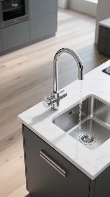 俯视角构图,在一个极简北欧风格的L型厨房转角,阳光从倾斜的天窗洒落形成菱形光斑,照亮深灰色哑光石英石台面。左侧悬挂式置物架上,三个手工陶瓷碗(灰蓝渐变釉面)叠放成螺旋状,旁边倒挂着两个黄铜咖啡杯和一把竹纤维餐布。右侧墙面安装着模块化磁吸刀架,整齐吸附着五把不同尺寸的日本旬刀,刀刃反射出冷冽的金属光泽。台面上,几何造型的白色珐琅锅旁散落着几颗带叶草莓,透明玻璃量杯里盛着琥珀色蜂蜜,旁边是一株垂吊的佛珠吊兰,藤蔓自然垂落在台角。开放式层板上,三个锥形玻璃瓶分别装着薰衣草干花、燕麦片和彩色藜麦,右侧迷你陶瓷花盆里的罗勒正舒展着心形叶片。地面浅灰色六边形瓷砖与墙面白色文化石形成材质对比,角落的橄榄绿垃圾桶与黄铜水龙头形成低调的色彩呼应,整体空间通过非对称平衡营造出有序的生活韵律感。
