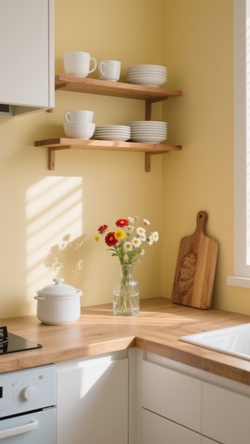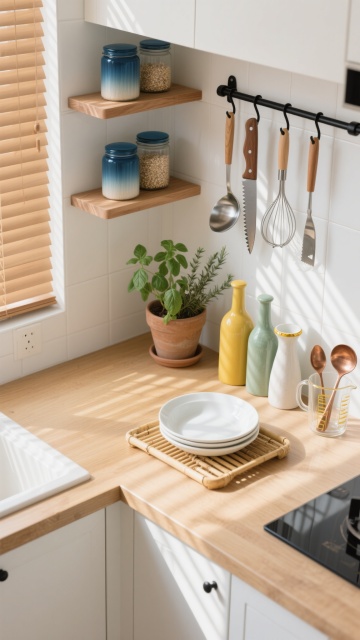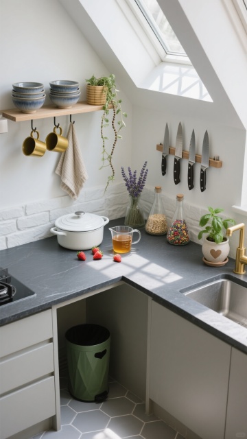 俯视角构图,在一个极简北欧风格的L型厨房转角,阳光从倾斜的天窗洒落形成菱形光斑,照亮深灰色哑光石英石台面。左侧悬挂式置物架上,三个手工陶瓷碗(灰蓝渐变釉面)叠放成螺旋状,旁边倒挂着两个黄铜咖啡杯和一把竹纤维餐布。右侧墙面安装着模块化磁吸刀架,整齐吸附着五把不同尺寸的日本旬刀,刀刃反射出冷冽的金属光泽。台面上,几何造型的白色珐琅锅旁散落着几颗带叶草莓,透明玻璃量杯里盛着琥珀色蜂蜜,旁边是一株垂吊的佛珠吊兰,藤蔓自然垂落在台角。开放式层板上,三个锥形玻璃瓶分别装着薰衣草干花、燕麦片和彩色藜麦,右侧迷你陶瓷花盆里的罗勒正舒展着心形叶片。地面浅灰色六边形瓷砖与墙面白色文化石形成材质对比,角落的橄榄绿垃圾桶与黄铜水龙头形成低调的色彩呼应,整体空间通过非对称平衡营造出有序的生活韵律感。