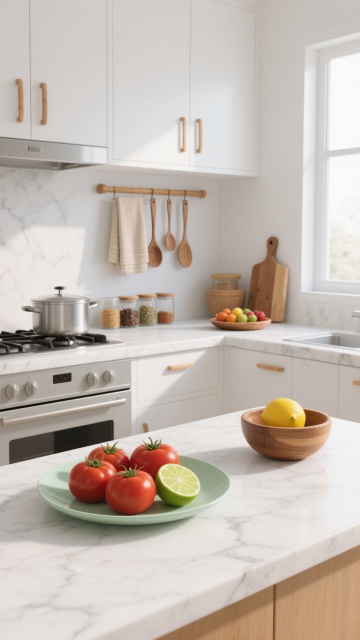 软3D风格的现代简约厨房场景,整体采用明亮的白色调为主,搭配原木色的温暖点缀,营造出清新自然且宁静舒适的氛围。画面以大理石纹理的白色厨房台面为视觉焦点,台面上放置一个浅绿色的盘子,里面装有几颗鲜红饱满的西红柿和被切开的青柠。台面右侧边缘有一个木碗,里面放着一个黄色的柠檬。背景中,白色的橱柜带有简约的木质把手,橱柜上方的墙壁上挂着一个木质挂杆,上面挂着几条浅色的毛巾和几个不同大小的木质锅铲、汤勺。灶台位于左侧,上面有一个银色的锅具,旁边的台面上摆放着装有各种香料的玻璃罐、一个木质砧板以及盛放着彩色水果的木盘。右侧窗户透进柔和的自然光,在台面和橱柜上形成清晰而柔和的光影效果,光线明亮且均匀,阴影过渡自然。整体画面构图遵循三分法,物体摆放错落有致,空间感强,细节丰富,具有柔和的3D质感和平滑的材质表现,色调和谐统一,给人一种干净整洁、温馨宜居的感觉。