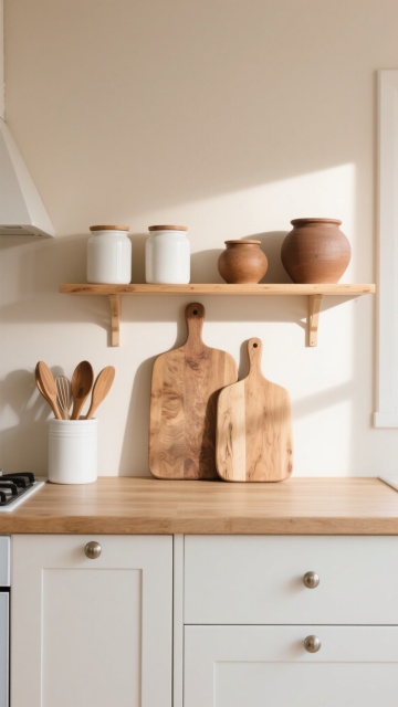 中景俯视角,在一个融合自然材质与几何美学的日式侘寂风厨房空间,浅米色硅藻泥墙面与烟熏橡木色的悬浮式橱柜形成温暖对比,台面选用带有天然冰裂纹理的火山岩材质,边缘打磨得圆润柔和。晨光透过亚麻质地的半透光障子门,在地面投下细密的木纹格栅阴影,光线呈现出柔和的米黄色调。料理台上,粗陶制成的深褐色食器套装随意摆放,旁边是一个手工编织的藤篮,里面盛放着几颗表皮粗糙的柑橘,复古铸铁茶壶正冒着袅袅热气,旁边点缀着一株小型琴叶榕盆栽,叶片上的天然虫洞更显岁月质感。开放式层架上陈列着不同釉色的粗陶碗碟,墙面悬挂着手工锻造的铁艺锅铲套装,整体构图强调材质的原始肌理与器物的自然磨损感,营造出淡泊宁静又充满生活温度的烹饪空间。