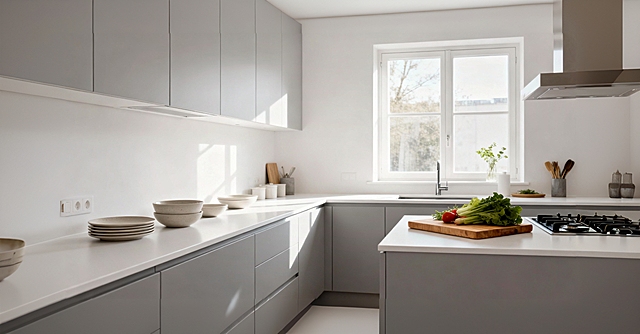极简主义风格的现代厨房,整体采用米白色哑光橱柜与浅灰色大理石台面,搭配原木色开放搁板,嵌入式黑色抽油烟机与银色微波炉位于灶台上方,台面摆放黑色锅具、两个橙色水果、透明玻璃罐和陶瓷碗,白色竖纹瓷砖墙面,自然光透过窗户形成柔和的光影效果洒在地面,整体氛围简洁明亮、干净整洁,具有高级的空间层次感和现代家居美学。
