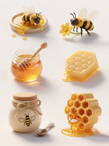 六个完全不同的蜂蜜主题元素,采用超写实3D风格,黄色和金色为主色调,高光泽质感,透明蜂蜜液体效果,白色纯色背景,每个元素独立呈现,规整排布成系列素材集合:1. 一只蜜蜂停在打开的玻璃罐蜂蜜边缘,罐口有滴落的蜂蜜;2. 一个带有木纹的蜂蜜搅拌棒,上面沾着粘稠的蜂蜜,滴落的蜂蜜形成拉丝效果;3. 一个装满蜂蜜的六边形蜂巢,部分蜂蜜从巢格中溢出;4. 一个带有标签的陶瓷蜜罐,罐口插着木勺,旁边散落几颗野花;5. 一片带有露珠的三叶草叶子,上面停着一只小蜜蜂,叶子上沾着蜂蜜;6. 一个被蜂蜜包裹的蜂巢饼干,饼干上有蜂蜜滴落的痕迹。每个元素都具有高度细节,包括蜂蜜的透明感、表面张力效果和光影反射,保持统一的超写实风格和视觉语言。
