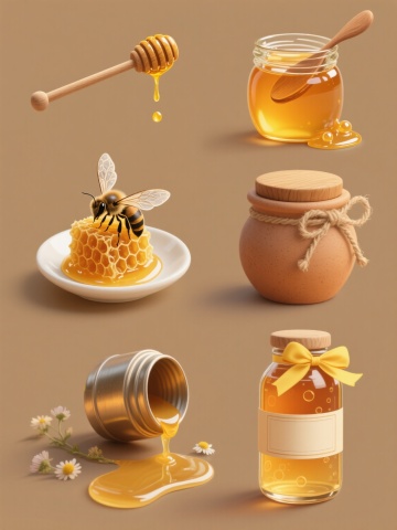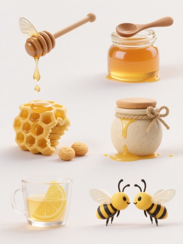 一组6个完全不同元素的蜂蜜主题系列素材,保持超写实摄影风格,纯白纯色背景,元素包括:1. 木质蜂蜜搅拌棒上滴落三滴晶莹蜂蜜,下方是堆叠的金黄色蜂巢;2. 一只翅膀透明带光泽的工蜂停在装满琥珀色蜂蜜的玻璃罐边缘,罐口有木勺;3. 被咬了一口的蜂巢造型饼干,旁边散落两颗完整的,表面有蜂蜜光泽;4. 老式陶瓷蜂蜜罐,罐口系着麻绳蝴蝶结,罐底有几滴溢出的蜂蜜;5. 透明玻璃杯中装着半杯蜂蜜水,水面漂浮一片柠檬片,杯壁有蜂蜜流痕;6. 两只相互触碰触角的卡通风格蜜蜂,翅膀呈半透明黄色,身体有黑色条纹,整体元素规整排布,每个元素独立成图,保持统一的金黄色调与高光泽质感,无文字、二维码及其他装饰元素。