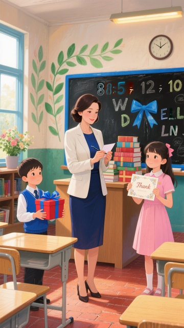 插画风教室,孩子们手捧礼物,温馨感谢老师,清新可爱,节日氛围浓厚。