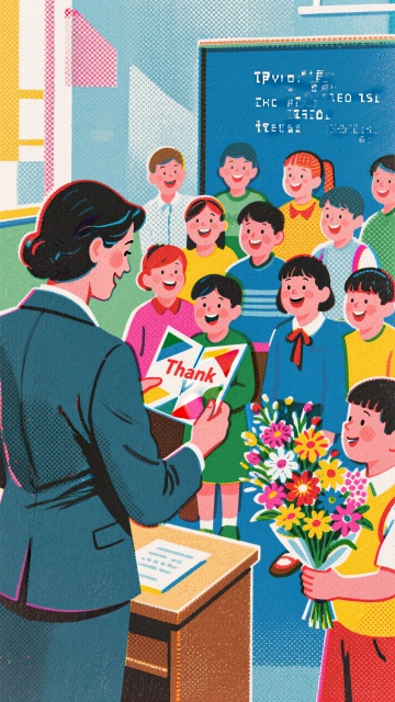 清新卡通插画风,噪点质感,学生献花给老师,温馨教师节场景。