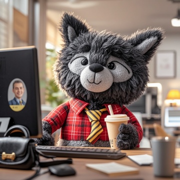 拟人风3D角色,猫咪身着商务西装,手握咖啡杯,办公桌前专注工作,展现职场幽默感。