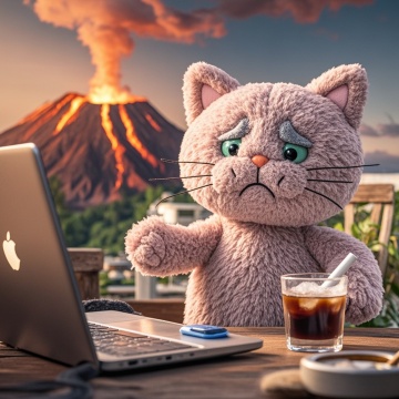 卡通感3D风拟人猫,火山背景,悠闲工作,创意幽默。