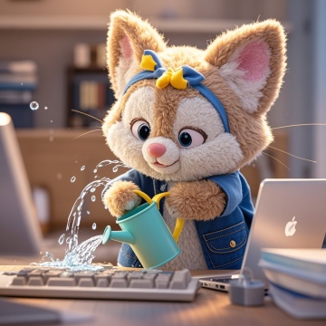 可爱卡通拟人3D角色,小狐狸手持水壶浇灌键盘,趣味盎然。