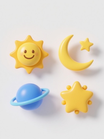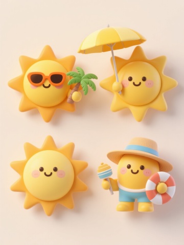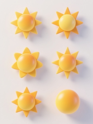 六个3D风格太阳图标,保持原图标黄色圆形主体、橙黄色放射状光芒和粉色腮红的配色方案,每个太阳拥有不同的样式设计,包括不同的表情(如微笑、眨眼、惊讶等)、光芒形状变化(如尖角形、圆形、火焰形等)和细节装饰(如戴小帽子、戴眼镜、带光晕等),整体采用圆润可爱的3D模型质感,具有平滑的渐变色彩过渡和柔和的高光阴影效果,六个太阳图标以整齐的两行三列网格形式排列在纯白色背景上。