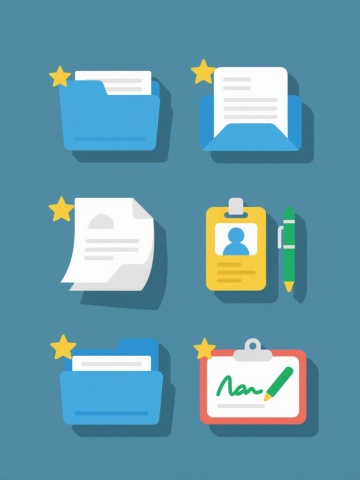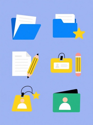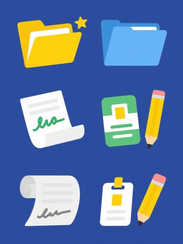 扁平化风格,纯白色背景,六个不同造型和角度的工作场景插画系列,每个场景均包含使用笔记本电脑的人物、蓝色文件夹、铅笔、图表等工作元素,保持橙色上衣与蓝色工作元素的配色方案,所有插画造型规整排布,简洁的线条,圆润的形状,明亮的色彩,无渐变效果,每个场景中的人物姿态和物品摆放角度各不相同,整体风格统一且具有系列感