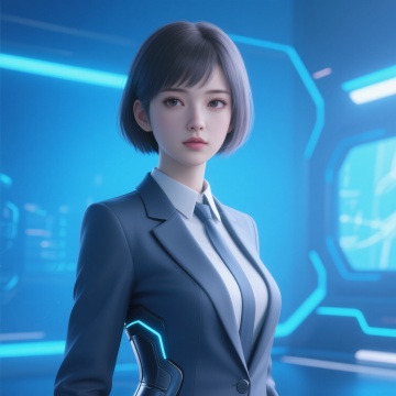 赛博朋克风3D角色,未来感金属质感,霓虹灯映衬下的科技夜景。