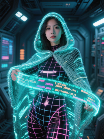 数据流编织成的连帽斗篷,实时滚动着发光代码,搭配霓虹网格紧身衣,黑客空间站场景,数字艺术