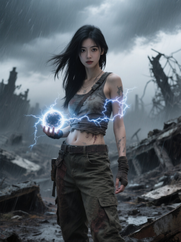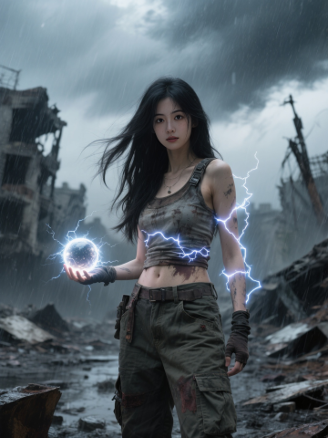 电弧缠绕的废土风背心和工装裤,手中握着能量球,狂风暴雨的末世废墟,电影海报风格