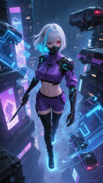 俯视角镜头,在被霓虹灯雨丝切割的赛博都市夜景中,一位半机械化改造的少女悬浮于全息广告牌与空中交通流之间,她拥有及腰的银白色不对称短发,左侧发绺挑染着荧光蓝并编有微型数据管线,右眼镶嵌着猩红光感义眼,面部覆盖着几何形的黑色机械面纹。她身着暗紫色机能风露脐作战服,肩部装配着碳纤维装甲,手臂延伸出可伸缩的纳米刀刃,黑色过膝战术靴底部喷射着淡蓝色反重力气流。周围环绕着全息投影的蓝色数据流与破碎的霓虹符号,背景是层叠的悬浮建筑与穿梭的磁悬浮车辆,雨水中倒映着扭曲的光影与她机械义肢的冷光,色调是赛博紫与电子蓝的强烈碰撞,整体画面充满科技感与未来冷峻美学。