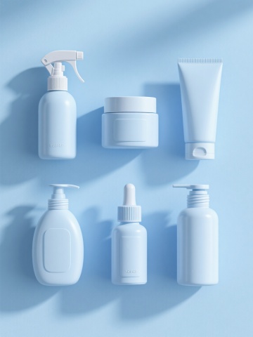 高清晰3D渲染的护肤品展示图,白色纯净背景,五款不同样式和类型的护肤品整齐排列,从左到右依次为:高瘦圆柱形透明蓝色玻璃喷雾瓶配银色按压泵头、中等高度圆柱形半透明渐变蓝玻璃喷雾瓶配银色金属盖、矮胖梨形透明蓝色玻璃喷雾瓶配银色按压泵、小巧圆柱形透明玻璃喷雾瓶配银色泵头、以及矮圆罐状透明玻璃面霜瓶配银色螺旋盖。所有瓶身具有光滑细腻的玻璃质感,内部液体呈现清澈的淡蓝色或透明色,瓶盖和泵头为高反光金属材质,带有细腻的光影反射和高光点。整体画面采用柔和的顶部光源,在瓶身底部形成轻微的阴影,增强立体感,构图对称平衡,视觉层级清晰,突出产品的高端质感和纯净简约的设计风格,信息传达直接高效,符合护肤品广告的目标受众审美。