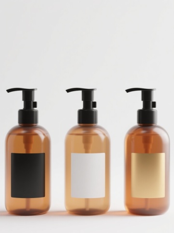 3D渲染风格的三瓶沐浴露产品展示图,整体采用写实主义设计,主色调为透明棕色瓶身搭配黑色按压泵头,光影效果呈现柔和的顶部光源,瓶身带有细腻的透明质感与轻微反光,阴影细节清晰自然,背景为纯白色纯色背景,三瓶沐浴露呈水平直线整齐排列,间距均匀,从左至右瓶身标签分别为纯黑色、纯白色和无标签透明瓶身三种不同样式外观,构图采用简洁的居中对称布局,画面干净整洁,突出产品主体,具有高清晰度的商业产品摄影质感,无任何文字、LOGO、二维码及额外装饰元素。