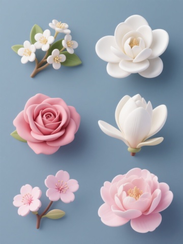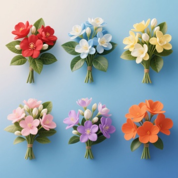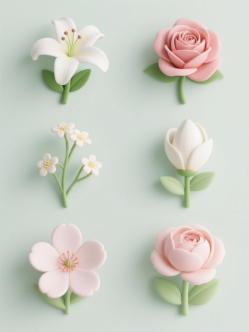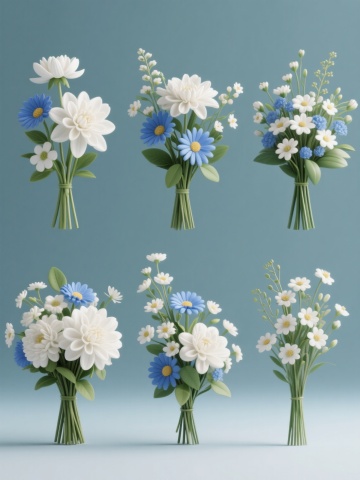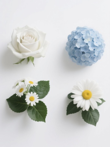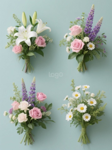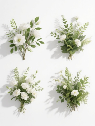 一张现代简约风格的花卉海报,以纯白色为背景,画面中包含四个规整排布的鲜花花簇素材,每个花簇均由不同种类的鲜花组成,整体造型简约现代。花簇中包含白色玫瑰、白色百合、粉色玫瑰、紫色飞燕草等多种花卉,搭配绿色枝叶作为点缀,花卉的色彩搭配和谐自然,光影表现柔和,具有清晰的3D质感和写实的细节刻画,整体构图对称且富有层次感,无任何文字、logo或水印。