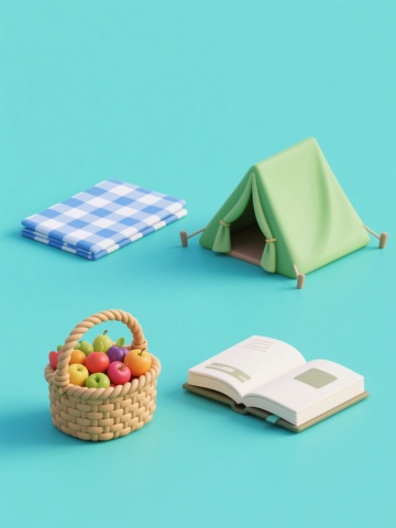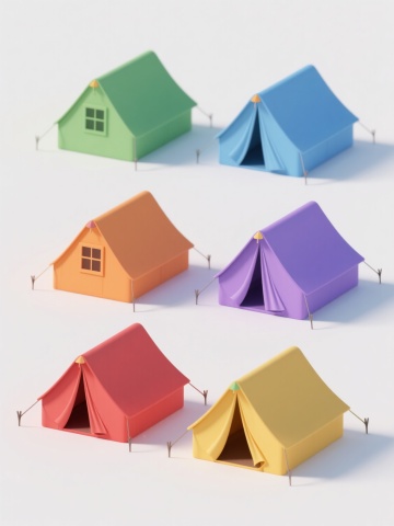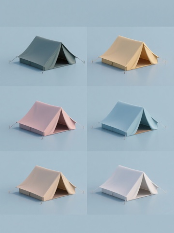 6个简约现代风格的不同颜色不同样式帐篷,保持3D渲染质感,平滑的材质过渡,柔和的光影效果,统一的纯色背景,帐篷形态结构清晰,白色支架细节,采用规整的网格排布,整体视觉简洁干净,无任何文字、logo和水印。