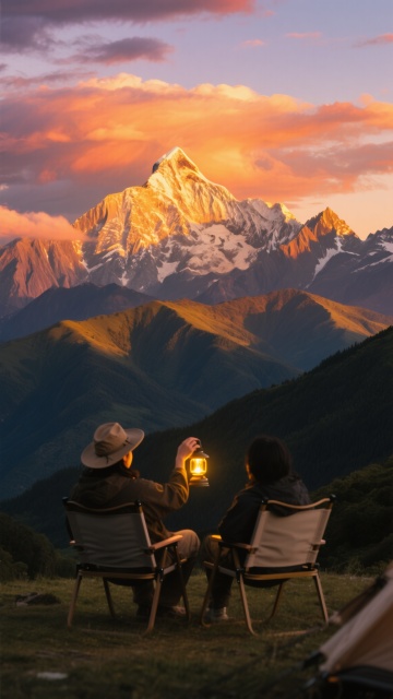 旅行主题摄影风格,日落时分的壮丽山景,远处雪山峰顶被金色霞光映照,云层呈现橙红与淡紫渐变,中景层叠的山峦覆盖着深色植被与金色阳光的交错光影,前景中两个背对观者的人物坐在露营椅上,一人戴着宽檐帽举手轻触同伴手中的暖黄色露营灯,人物轮廓被逆光勾勒出金色边缘,整体画面温暖治愈,充满探索与陪伴的旅行氛围,采用写实摄影质感,自然光影过渡柔和,色彩和谐统一,构图遵循三分法,天空、山峦与人物形成清晰视觉层次,突出旅行中的自然奇观与人文温度。