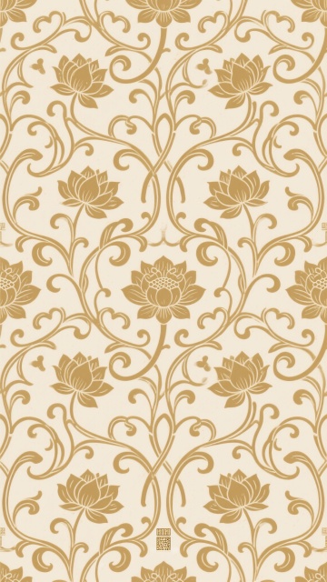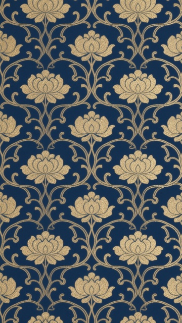 一张具有东方传统美学风格的无缝背景纹样图,纹样为精致的缠枝莲纹,线条流畅细腻,以深蓝色为底色,金色线条勾勒纹样轮廓,整体呈现出典雅庄重的氛围,纹样排列整齐有序,形成高度对称且具有节奏感的重复图案,适合用于传统服饰、包装设计或文化产品的背景装饰。