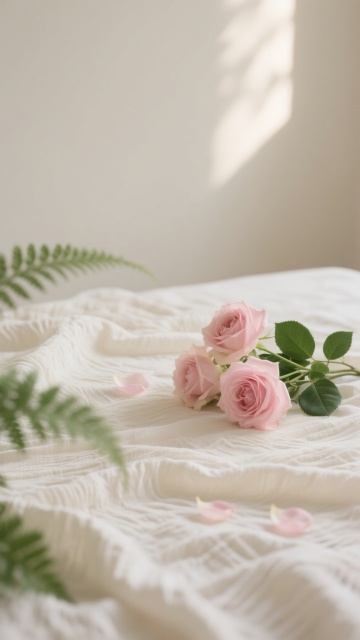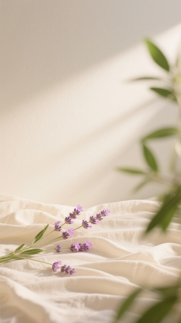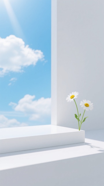一张具有温暖治愈氛围的室内静物照片,画面以柔和的米褐色墙面为背景,墙面带有细腻的肌理质感。右下角前景中,一块带有自然木纹和粗犷边缘的深棕色木板作为台面,上面放置着一个透明玻璃材质的细长花瓶,瓶中插有几枝白色的小碎花,花朵形态轻盈,部分花瓣微微张开,枝条自然弯曲,花瓶内装有少量清水。木板上还散落着一两朵同样的白色小花。整体光影呈现出柔和的侧逆光效果,光线从左上角斜射而下,在墙面上形成渐变的光影层次,照亮了花朵和花瓶的边缘,营造出温馨、宁静、自然的居家氛围,色调统一在温暖的米色、棕色和白色之间,画面简洁而富有质感,具有清晰的视觉层次和柔和的景深效果。