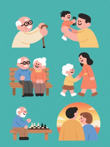 六个不同人物组合的温馨生活场景,采用统一的扁平矢量插画风格,纯色背景,明亮柔和的色彩搭配,圆润的线条和简洁的造型,角色表情亲切自然,画面充满生活气息。第一幅:一位白发老爷爷戴着眼镜坐在木椅上看报纸,旁边是一位老奶奶端着茶杯微笑着看着他;第二幅:一对中年夫妻在厨房里一起做饭,丈夫在切菜,妻子在炒菜,两人相视而笑;第三幅:一位中年妈妈牵着一个小女孩的手在公园里散步,小女孩手里拿着气球;第四幅:一位白发老奶奶坐在沙发上织毛衣,旁边的小孙女趴在她腿上听故事;第五幅:一位中年爸爸陪着小男孩在书房里看书,爸爸用手指着书本上的内容;第六幅:一对老年夫妻在阳台上浇花,老爷爷扶着栏杆,老奶奶拿着水壶浇花,两人面带微笑。所有场景排布规整,形成系列素材集合。