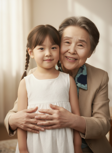 写实风格家庭温馨场景,柔和自然光从左侧窗帘缝隙洒入客厅,形成温暖光斑,浅米色墙壁搭配原木色置物架,灰色布艺沙发上,白发祖父穿着浅棕色毛衣和米色裤子坐在左侧,抱着一本彩色绘本,身旁小女孩穿着浅色连衣裙和白色袜子露出开心笑容,祖母穿着米白色针织开衫和米色长裙坐在右侧,面带微笑,年轻父母从沙发后方俯身靠近,母亲穿白色上衣,父亲穿深蓝色开衫内搭白色T恤,五人围绕绘本互动,洋溢着幸福欢乐的家庭氛围,木质地板上铺着浅色地毯,整体色调温暖和谐,光影柔和自然,构图聚焦于家庭成员间的亲密互动。