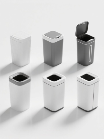 六个不同款式、不同样式、不同配色的垃圾桶,白色背景,排列整齐,每个垃圾桶都具有现代简约的设计感,表面光滑,带有不同的纹理细节和色彩搭配,整体呈现出干净整洁的视觉效果,光照均匀,阴影柔和,突出垃圾桶的立体感和材质质感。
