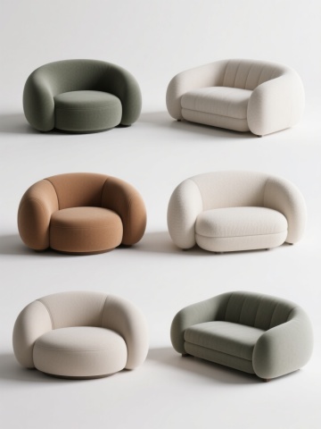 3D渲染风格,六个不同配色、不同样式、不同材质的沙发造型,白色背景,上下两行对齐排列,每个沙发都具有圆润饱满的造型和细腻的材质质感,光影柔和自然,高光和阴影过渡平滑,整体呈现出现代简约的设计感,构图对称均衡,画面干净整洁,突出沙发的设计细节和材质纹理。