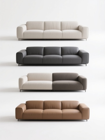 一张展示4个不同配色、不同样式、不同材质沙发造型的产品海报,白色背景,上下两行对齐排列。整体采用高品质3D渲染,具有超写实的质感表现,皮革沙发呈现出细腻的纹理和柔和的光泽,高光和阴影过渡自然,立体感强。沙发造型设计简约现代,线条流畅,每个沙发都有独特的设计细节,如不同的扶手形状、靠背高度、坐垫样式和腿部设计。色彩搭配和谐,每个沙发的配色都具有鲜明的个性和时尚感。画面采用居中对称构图,视觉层级清晰,4个沙发大小一致,排列整齐,形成稳定的视觉平衡。整体风格简洁、专业、高端,突出产品的设计感和质感,适合用于家具产品展示和销售推广。