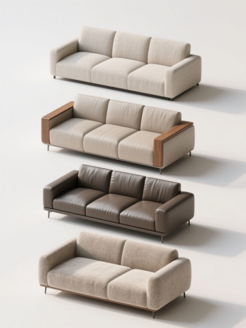 高质量3D渲染的现代家具展示图,画面中有四个不同样式、不同风格、不同材质的沙发,它们整齐排列在纯白色背景上。每个沙发都具有清晰的边缘和光滑的表面处理,光线从上方柔和均匀地照射下来,在沙发底部形成淡淡的阴影,增强立体感。沙发的材质细节丰富,包括但不限于:细腻的布料纹理、光滑的皮革表面、温暖的木质扶手、柔软的绒布质感等,整体呈现出专业产品摄影的清晰锐利和真实感,色调以中性色系为主,突出沙发本身的设计和材质特点,构图均衡,视觉焦点集中在沙发上,无任何多余元素干扰。