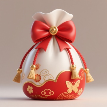 3D风格的福袋,变换样式造型,保持纯色背景,主色调为红色与白色,搭配金色装饰,高光明显,阴影柔和,表面光滑有光泽,袋身上有金色的花朵和蝴蝶图案,顶部系着一个大大的红色蝴蝶结,蝴蝶结中间有金色的装饰物,袋口两侧有红色的绳带和金色的流苏,整体呈现出喜庆、吉祥的氛围,立体感强,细节丰富,构图居中,视觉焦点突出。